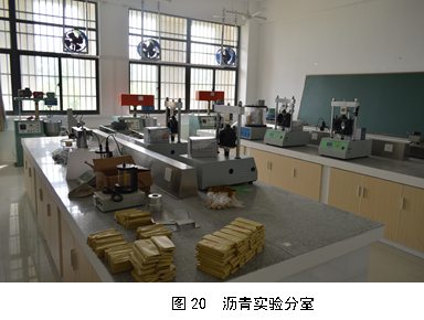 3)建筑材料实验分室(综合二号实验楼107、108室):已建设水泥实验室(107室),沥青实验室(108室)和标准试样养护室,实验室总建筑面积248.8m2。主要设备包括:(1)水泥、混凝土制备及检测设备:水泥胶砂振实台、水泥胶砂搅拌仪、水泥净浆搅拌机、干燥箱4台、恒温水浴各4台,振筛机3台,恒温恒湿混凝土养护箱、混凝土振动台、砂浆搅拌机、混凝土强制式搅拌机、数显混凝土含气量测定仪、数显勃氏透气比表面积测定仪、快速氯离子与碱含量综合测试仪、抗渗仪、负压筛析仪、电动抗折机各2台,混凝土裂缝深度检测仪、直读混凝土裂缝宽度检测仪、钢筋保护层测定仪、混凝土电阻率测定仪、颗粒分析仪、石粉含量测定仪各1台,混凝土养护室控制设备1套,各类天平21台,各类直径标准砂、石筛8套;(2)沥青混合料制备及检测设备:沥青搅拌机、沥青混凝土搅拌机、自动软化点仪、数显恒温沥青延伸仪、沥青针入度仪、数显马歇尔稳定度、马歇尔稳定度测定仪各2台,沥青延度仪、乳化沥青电荷试验仪、集料加速磨光机、乳化沥青稠度仪、沥青标准粘度计、沥青运动粘度计、乳化沥青粘结力测定仪、乳化沥青水泥适应性搅拌机各1台,设备总资产38.6万元。