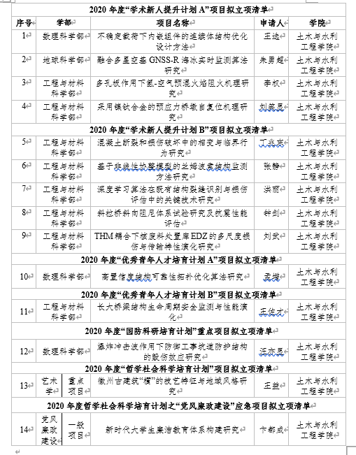 获批项目具体包括:“学术新人提升计划A”4项、“学术新人提升计划B”5项、“优秀青年人才培育计划A”1项、“优秀青年人才培育计划B”1项、“哲学社会科学培育计划重点项目”1项、“哲学社会科学培育计划党风廉政建设应急项目”1项、“国防科研培育计划重点项目”1项。项目详情见附表。