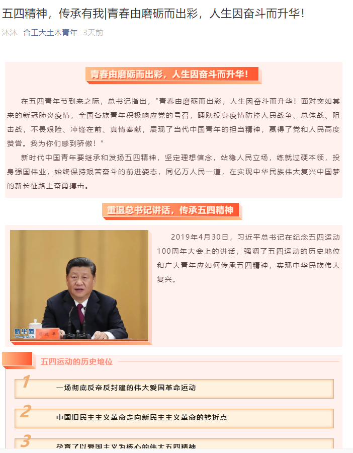 以网为媒,依托班级团支部、学生党支部和学生会积极开展系列主题教育活动,深化大学生思想政治教育,引导广大青年学子牢记总书记嘱托,继承和发扬五四精神,坚定理想信念,练就过硬本领,不懈拼搏奋斗,用青春的蓬勃力量和时代的责任担当,谱写出更加嘹亮的青春战歌,为决胜全面小康、决战脱贫攻坚贡献青春智慧和力量。