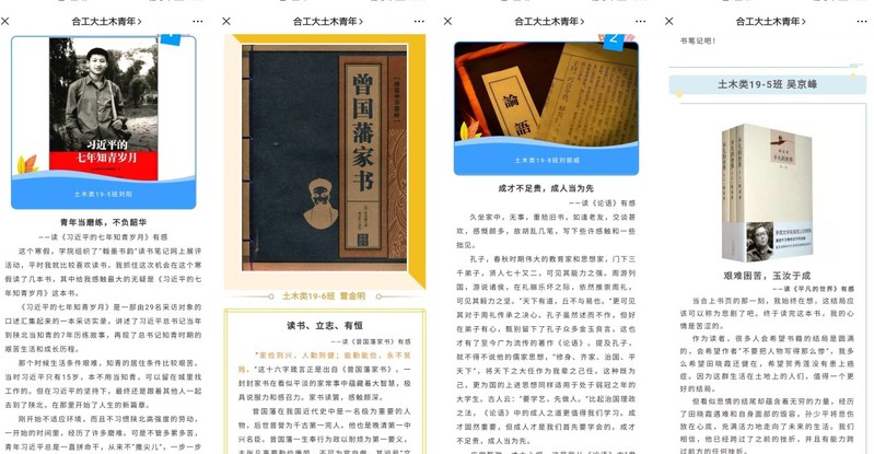 读红色经典,弘扬爱国情怀。爱国主义是中华民族的民族心民族魂,阅读红色经典,旨在激发广大青年爱国情怀,激励青年学子将爱国情、强国志、报国行自觉融入实现中华民族伟大复兴的奋斗之中,为祖国建设添砖加瓦。土木类19-2班郭雷用“做有时代担当的青年”一句话道出他读完《习近平的七年知青岁月》的感受。作为新时代的新青年要向习近平总书记学习,就是要永葆肯吃苦、不怕苦的奋斗精神,养成爱读书、善思考的习惯。他写道:“勉之期不止,多获由力耘。不管是作为一名大学生,还是作为一名普通的新时代中国有志青年,我都将牢记党和国家的要求,以青年时期的习近平总书记为榜样,勤奋读书增长学识;坚持锻炼强壮体魄;扎身脚下的土地,去为人民服务。”土木类19-2班王海成读完《毛泽东选集》说到:“每次拿起《毛泽东选集》,都会被伟人那朴实的文风和字里行间透出的果断刚毅的风范所折服。毛泽东同志是中国人民的伟大领袖,是伟大的思想家、哲学家、军事家、著作家,也是一位充满激情的诗人。以毛泽东同志为主要代表的中国共产党人创造性地把马克思主义理论与中国实际相结合,从理论和实践上探索出一条适合中国国情的发展道路。”
