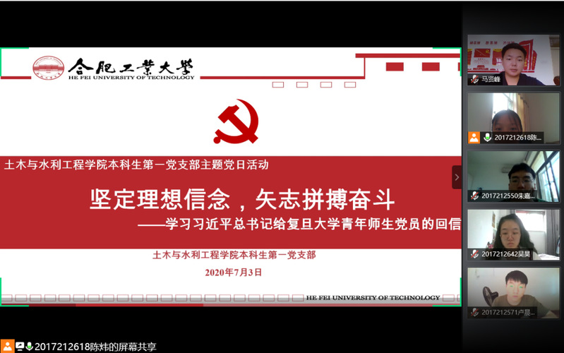 为进一步教育引导学生党员坚定理想信念,践行初心使命,在中国共产党成立99周年之际,色情网址大全 本科生第一党支部在线上开展了“坚定理想信念,矢志拼搏奋斗”主题党日活动,支部全体党员参与本次活动。