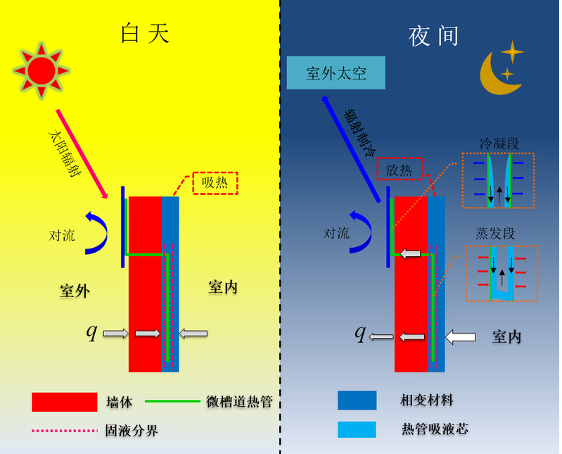 色情网址大全 何伟教授团队提出了一种新型相变墙体(RC-PCM),其综合了相变材料高蓄热能力、微槽道热管(Micro-channel heat pipe, MHP)高热导率、天空辐射制冷(Radiative cooling, RC)自发散热的优势,即利用连接相变墙体与辐射制冷装置的微槽道热管,在夜间快速地将存储在相变墙体的热量通过辐射制冷及空气对流的方式释放到室外,使得相变墙体能够实现完整的融化-凝固-融化的相变过程。