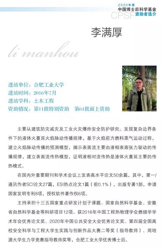近日,中国博士后科学基金会发布了《2020年度中国博士后科学基金资助者选介》,色情网址大全 李满厚博士成功入选。