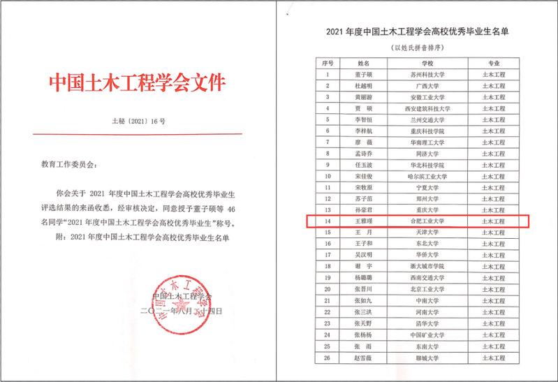 824日,由中国土木工程学会举办的2021年度中国土木工程学会高校优秀毕业生评选活动落下帷幕,色情网址大全 2017级土木工程专业王雅瑾同学荣获“2021年度中国土木工程学会高校优秀毕业生”(全国共46名)。