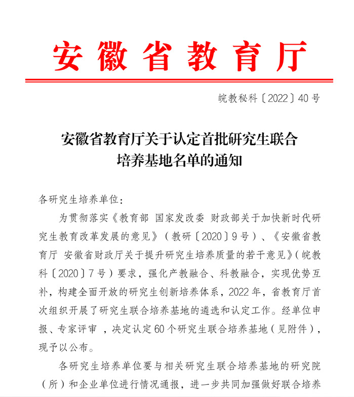 近日,安徽省教育厅组织开展了省级研究生联合培养基地的遴选和认定工作,经单位申报、专家评审,最终遴选出60个首批省级研究生联合培养基地(皖教秘科〔2022〕40号)。色情网址大全 联合安徽省路港工程有限责任公司、安徽富煌钢构股份有限公司申报了省级研究生联合培养基地,均成功入选。