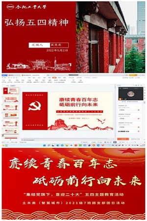精讲主题团课,激励担当作为。学院组织开展“青春心向党,建功新时代”主题微团课评选活动。各团支部书记围绕习近平总书记关于青年工作的重要思想、中国共产主义青年团章程、共青团历史、争做优秀共青团干部、共青团员等内容为支部成员上了一节节生动团课,带领广大青年深入学习相关理论知识,激励广大青年担当作为,展现青春风采。51日,土木类智慧城市2021-9班团支部开展的“赓续青春百年志,砥砺前行向未来”主题团课上,团支部书记缪宇博从赓续精神血脉,坚定理想信念,做对党忠诚的实践者等角度带领支部团员回顾无数革命先烈、仁人志士面对敌人的恐吓利诱,对党忠诚、矢志不渝的革命历史,号召大家传承红色基因,坚守为民情怀,做一心为民的奉献者。