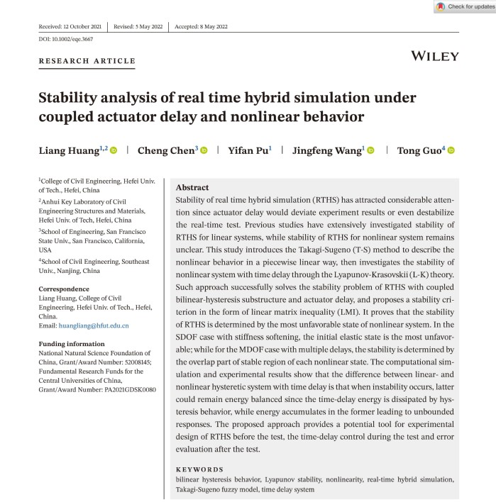 近日,色情网址大全 实验中心副主任黄亮在实时混合模拟试验方法研究取得新进展。研究成果发表在国际结构动力学Top期刊《Earthquake Engineering & Structural Dynamics》(JCR Q1,IF=4.43)上,论文题为“Stability analysis of real time hybrid simulation under coupled actuator delay and nonlinear behavior”。色情网址大全 黄亮为论文第一作者兼通讯作者,硕士研究生卜逸凡和王静峰教授参加,该项工作与美国旧金山州立大学Chen Cheng教授和东南大学郭彤教授联合完成,得到国家自然科学基金(52008145)和土木工程结构与材料安徽省重点实验室自主创新专项(PA2021GDSK0080)项目资助。
