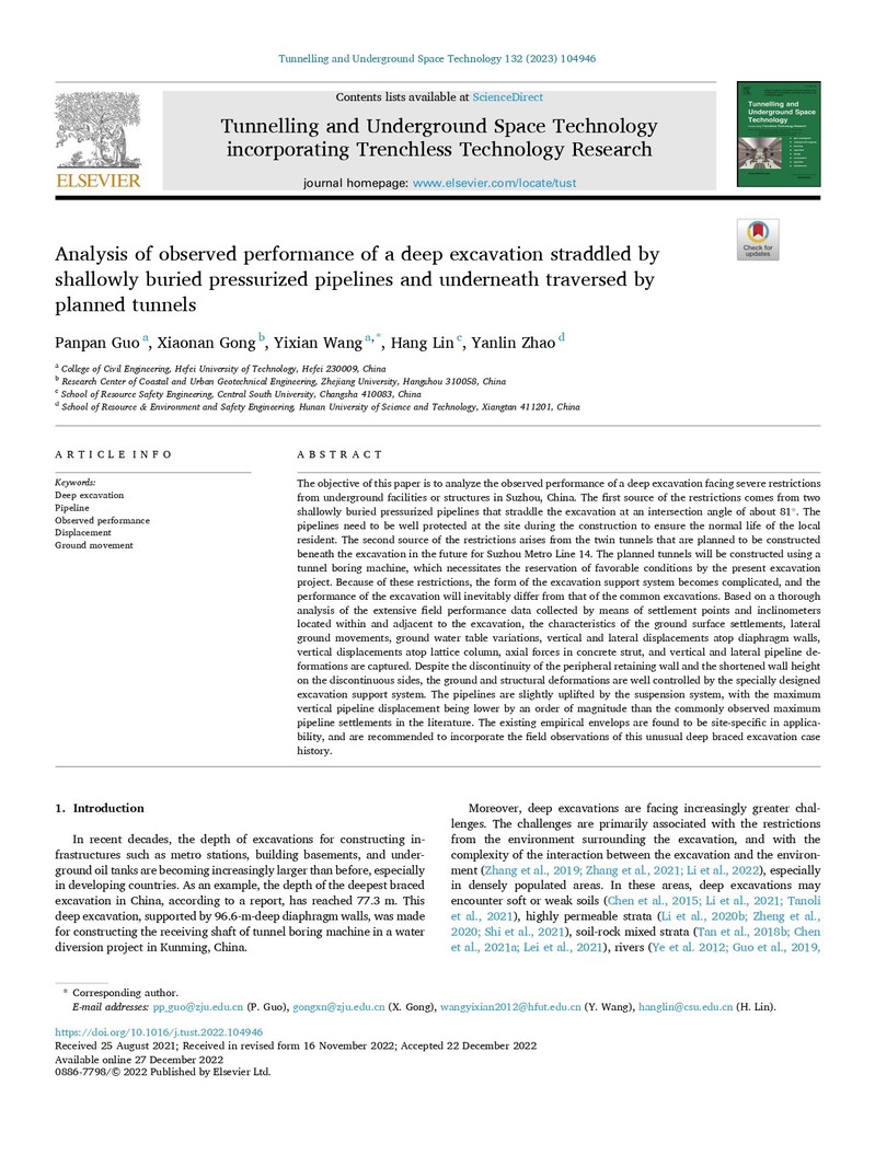 近日,色情网址大全 汪亦显教授团队在隧道及地下工程领域顶尖期刊《Tunnelling and Underground Space Technology》上发表题为“Analysis of observed performance of a deep excavation straddled by shallowly buried pressurized pipelines and underneath traversed by planned tunnels”的研究论文。我校青年教师郭盼盼博士为第一作者,汪亦显教授为通讯作者。
