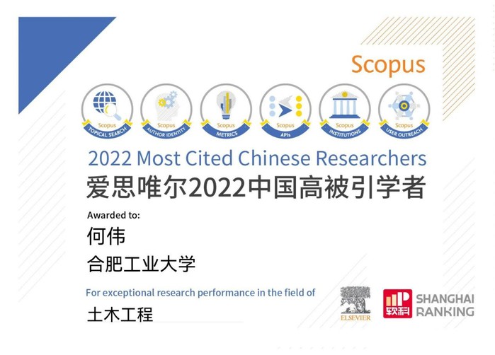 近日,爱思唯尔(Elsevier)发布2022“中国高被引学者”(Highly Cited Chinese Researchers)榜单,全国上榜共计 5216人,色情网址大全 13人入选。土木工程学科领域国内有107人上榜,色情网址大全 何伟教授荣登榜单。
