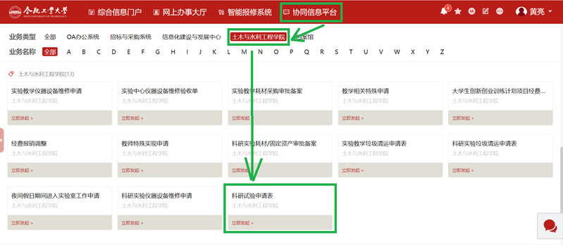 (1)试验申请人(本科、研究生)打开 【信息门户】→【协同信息平台】→【色情网址大全 】→【科研实验申请表】,填写试验申请。
