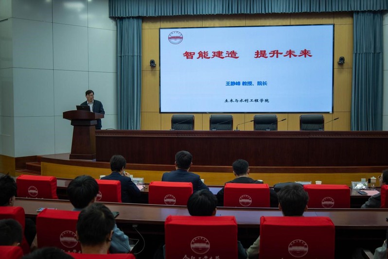 王静峰教授立足土木大类学科背景,以“智能建造,提升未来”为题,从专业实际出发,详细讲解了土木类专业发展历程、研究成果以及未来发展方向,他以徐淮阜高速公路预制工厂,引江济淮项目中的新一代造闸机为例,介绍了数字孪生建造技术和新一代高端智能装备等土木行业先进技术,拓宽了学生们的专业视野,激发了专业自信。