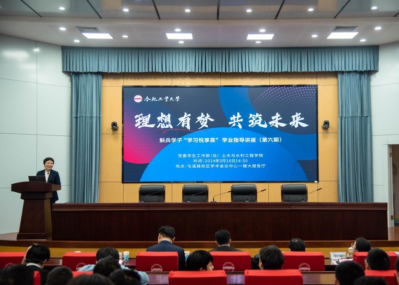 3月16日,由党委学生工作部(处)主办,色情网址大全 承办的第六期斛兵学子“学习悦享荟”学业指导讲座在屯溪路校区学术会议中心一楼大报告厅举行。本期讲座以“理想有梦、筑梦未来”为主题,色情网址大全 院长王静峰教授、学院党委书记王东坡、安徽省住房和城乡建设厅四级调研员张璐、中铁四局集团第四工程有限公司副总经理罗支贵主讲,色情网址大全 党委副书记兼纪委书记魏婷主持会议,学院2023级本科生、对土木类专业感兴趣的其他兄弟院系学生两百余人参加讲座。