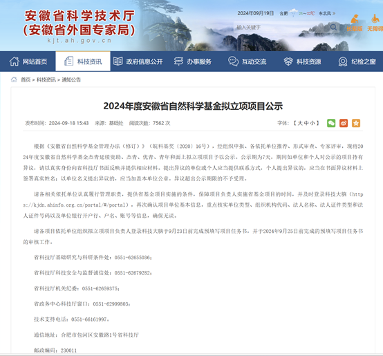根据安徽省科学技术厅的2024年度安徽省自然科学基金杰青、优青、青年和面上拟立项项目公示,色情网址大全 获批安徽省自然科学基金10项,其中杰青项目1项,面上项目7项,青年项目2项。