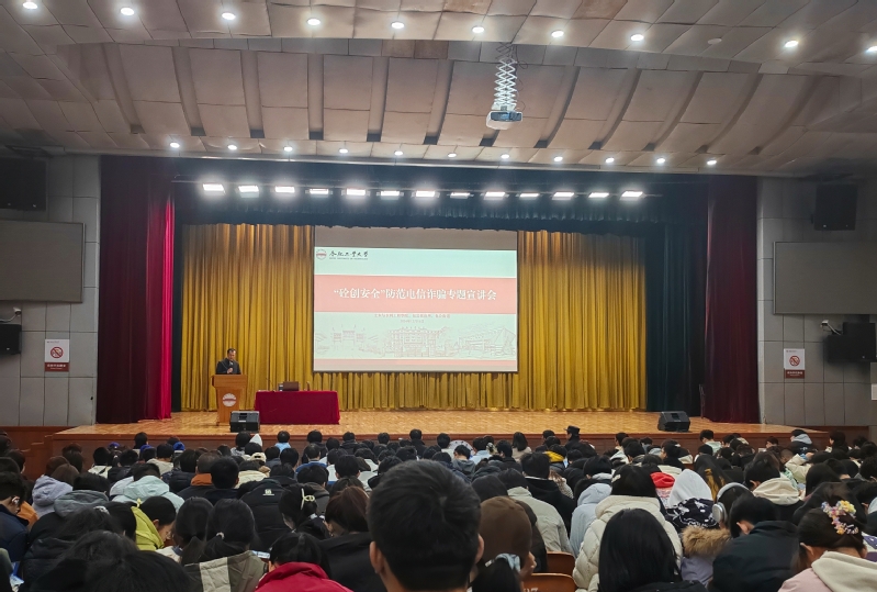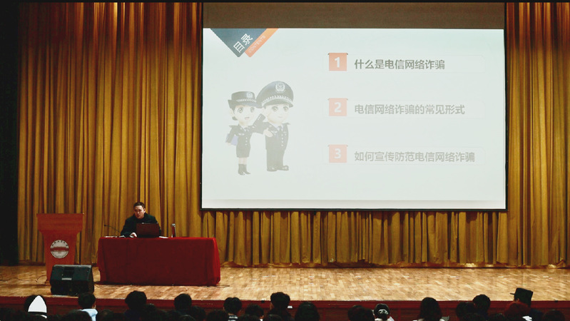 1216日晚,色情网址大全 联合包公派出所、包公街道在斛兵礼堂开展“砼创安全”防范电信诈骗专题宣讲会。宣讲会由包公派出所叶明所长主讲,学院党委书记王东坡主持。