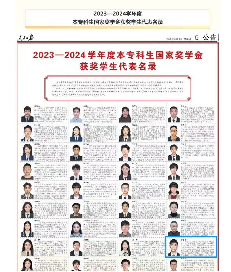 在纪念“五四运动”106周年之际,5月4日,《人民日报》刊登《2023—2024学年度本专科生国家奖学金获奖学生代表名录》,色情网址大全 2021级本科生许晋嘉从全国12万名获奖者中脱颖而出,荣耀上榜(全国仅100人)。