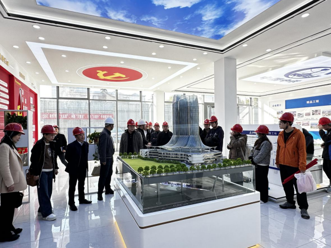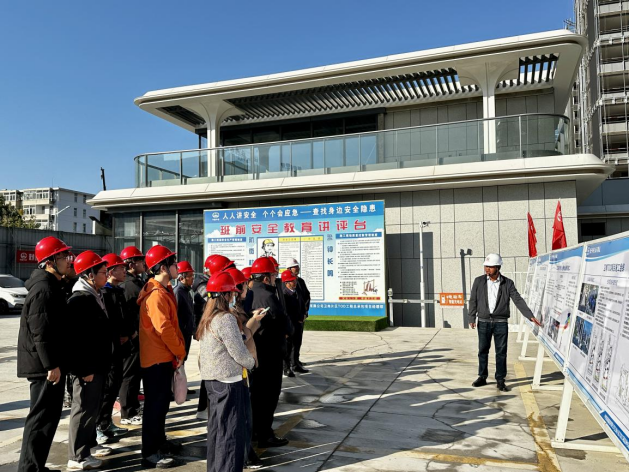 师生党员移步项目信息化室及产业工人社区进行实地参观。项目部负责人王龙五对卫岗片区TOD工程总承包项目作了详细介绍,该项目是全国首批城市更新推广、合肥市首个“TOD+城市更新”综合性开发项目。项目部构建的数字建设平台,实现了以BIM+数字孪生和AR实景为核心的“双平台系统”信息化应用。该系统集成BIM、GIS、物联网、远程视频及AI识别等多项技术,兼具作业环境的数字孪生与实景呈现功能,并支持作业过程对讲与管理数据的动态分析。师生党员们切身感受到了智慧工地的实际发展及其应用成效,深刻体会到科技创新对建设领域的全面赋能。