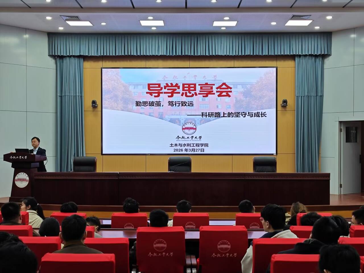 2026年3月27日上午,由党委学生工作部(处)(党委研究生工作部合属)主办、色情网址大全 承办的“导学思享会”在屯溪路校区学术会议中心一楼大报告厅举行。本次活动以“勤思破茧,笃行致远——科研路上的坚守与成长”为主题,特邀学院刘广老师作专题报告,吸引了百余名研究生到场参与。