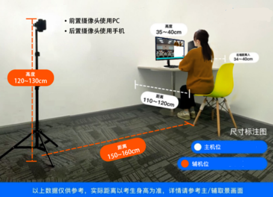5.设备摆放要求:网络远程面试主设备,需要正向面对考生,复试全程开启,摄像头正对考生。复试过程中,要求视频中考生双手和头部全程在视频录像范围。网络远程面试监考及备用设备,摆放在考生侧后方(与考生后背面成45°角),能够全程拍摄考生本人和电脑屏幕,复试全程开启。复试考生就座和设备安放位置参考下图。